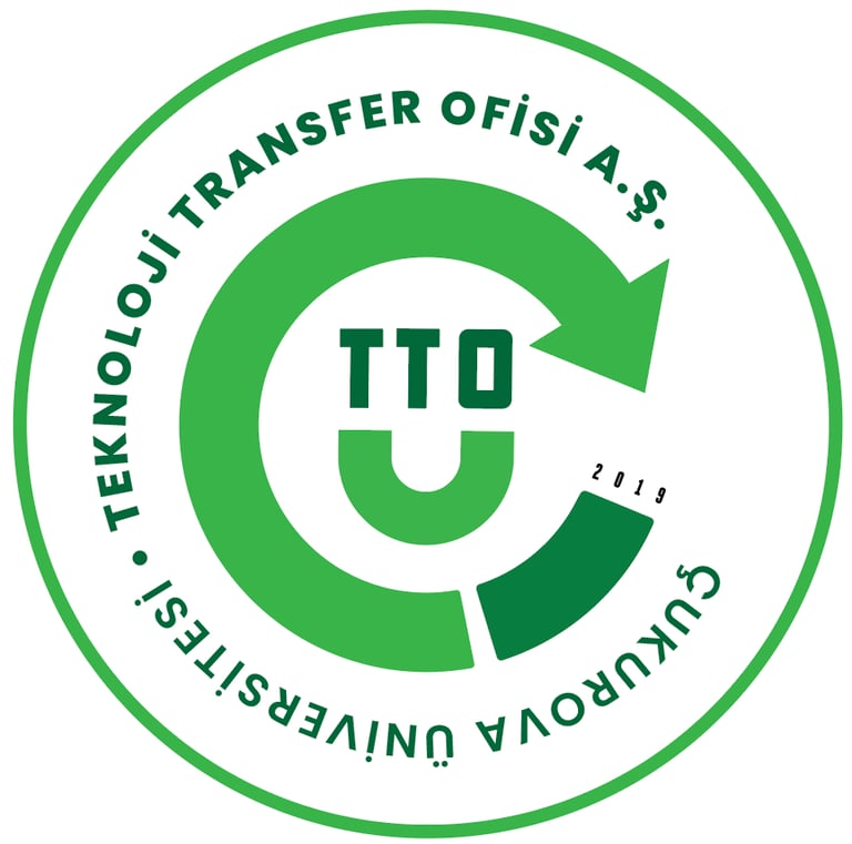 Designed for Çukurova University Technology Transfer Office Inc., this logo reflects the dynamic nature of innovation and university-industry collaboration. The circular loop, achieved using the golden ratio, functions as a technical diagram representing the transformation of knowledge into technology. The "TTO" acronym at the center is built upon a stylized base formed by the letters "Ç" and "Ü," representing the university's institutional identity. The rotation arrow emphasizes continuous development and technological transfer, while the technical drawing aesthetic of the overall composition reinforces the office's engineering and R&D-oriented professional approach.